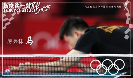 7月19日,中國乒乓球運動員馬龍在東京體育館進行賽前訓練,備戰東京奧運會。新華社記者 王東震 攝 制圖:馬平
