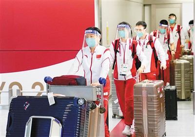 圖為7月19日,參加東京奧運會的中國體育代表團部分成員抵達東京成田機場。新華社記者 孟永民攝