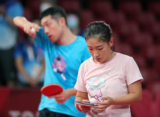 7月21日,劉詩雯(前)和許昕在訓練。新華社記者 王東震 攝