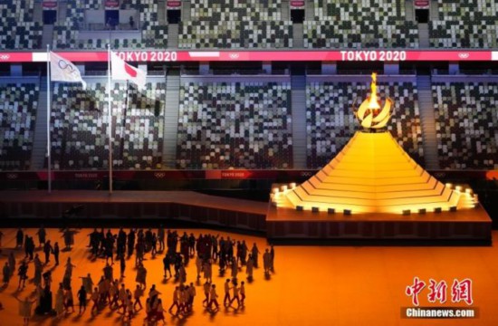 7月23日,第32屆夏季奧林匹克運動會開幕式在日本東京新國立競技場舉行。圖為主火炬被點燃。 中新社記者 杜洋 攝