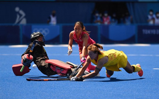 中國隊梁美玉(下右)在比賽中攻入制勝球瞬間。新華社記者李尕攝