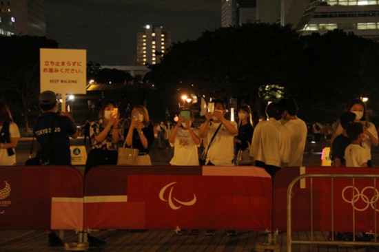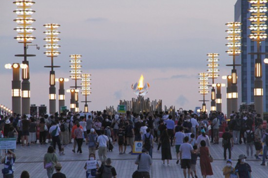 7月25日晚,日本當地民眾在東京“夢之大橋”上觀賞圣火臺。李沐航攝