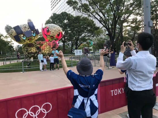 日本民眾與“夢之大橋”附近的東京奧運會、殘奧會吉祥物合影留念。李沐航攝