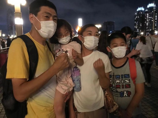 居住在日本的中國家庭前往“夢之大橋”觀看圣火臺,并為中國隊加油。李沐航攝