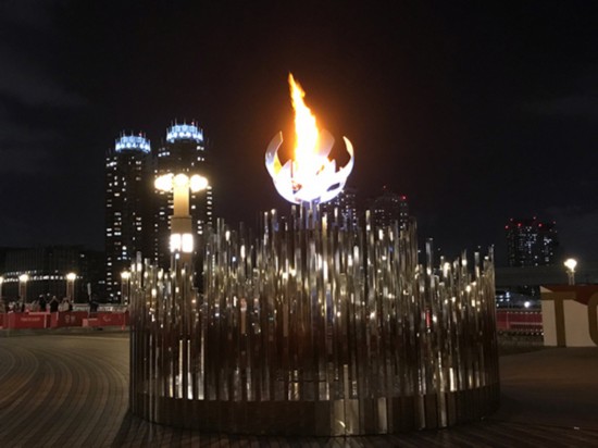 7月25日晚,奧運圣火在東京“夢之大橋”上的圣火臺內熊熊燃燒。李沐航攝