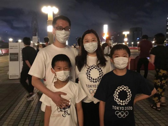 居住在日本的中國家庭身著奧運紀念T恤,前往“夢之大橋”觀看圣火臺。李沐航攝