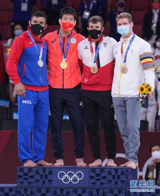 7月27日,冠軍日本選手永瀨貴規(左二),亞軍蒙古國選手莫拉(左一),季軍比利時選手卡斯(右一)和奧地利選手博爾查維利在頒獎儀式上。新華社記者 呂小煒 攝
