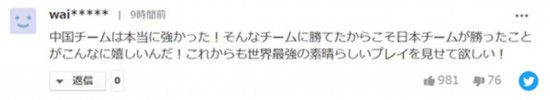 有日本網友留言表示,中國隊真的太強了!正因為日本戰勝了如此強大的隊伍,所以喜悅才更為強烈!請運動員們繼續讓我們觀看到最激動人心的精彩比賽吧!