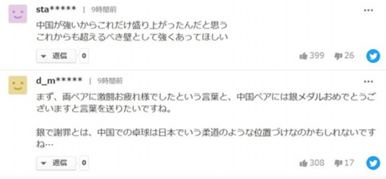 雖然中國乒乓球隊在男女混雙項目中惜敗日本隊,但從日本網友的鼓勵留言中可以感受到對中國乒乓球隊的喜愛和支持。經此一戰,中日觀眾也更加期待接下來兩國在乒乓球項目上的角逐。