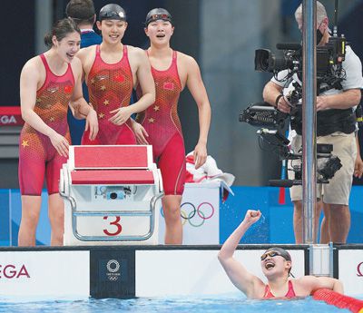 一個小時后,再度上場的張雨霏,又和隊友楊,u、湯慕涵和李冰潔一起,力壓澳大利亞隊和美國隊等強大對手,以7分40秒33的成績摘得女子4×200米自由泳接力的金牌。這是中國游泳在奧運會歷史上的首枚接力項目金牌,奪冠成績更改寫世界紀錄。兩枚金牌,兩破紀錄,“完美”二字也不足以形容中國泳將當日的表現。