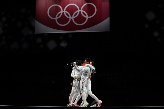 7月30日,日本隊選手在東京奧運會擊劍項目男子重劍團體金牌爭奪戰后慶祝。新華社記者鄭煥松攝