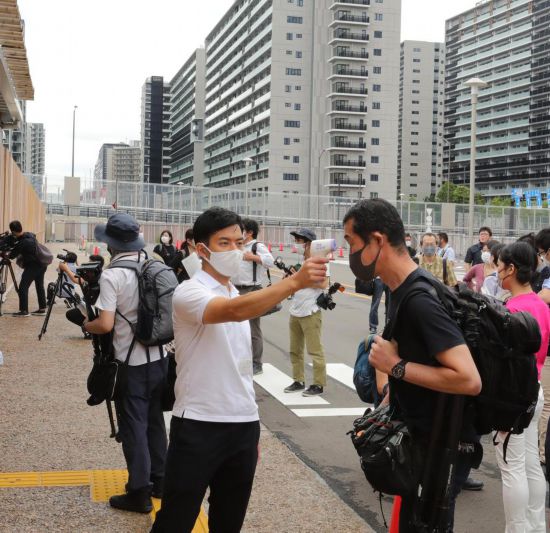 6月20日,工作人員為進入奧運村的記者測量體溫。新華社記者王子江攝