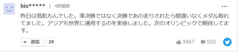 有網友留言:昨天看比賽的時候雞皮疙瘩都起來了。期待下屆奧運會上還有亞洲選手取得佳績。