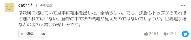 蘇炳添所獲得的成績不僅讓他在中國國內一戰封神,在日本也引起了廣泛熱議。許多網友在日本媒體的報道頁面下方留言表示祝賀,且每條留言也有大量點贊,更有日本網友直接稱呼蘇炳添為“蘇神”。