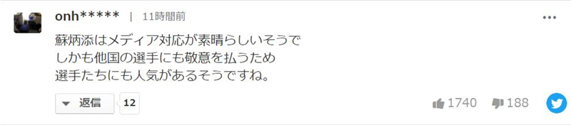 “聽說蘇炳添在接受媒體采訪時表現很出彩,而且對其他國家選手也非常尊重。好像在運動員群體中也很有人氣”,有網友留言如此評價。