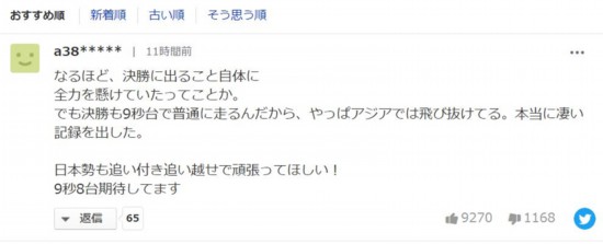 還有日本網友留言寫到:能進入決賽就已經證明了他拼盡全力。決賽中也跑出了10秒以內的成績,也是非常了不起的紀錄。希望日本隊的運動員也能追趕并超越這個紀錄。