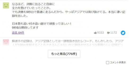 日本雅虎新聞網站上一篇有關蘇炳添的報道下方,網友留言達776條。