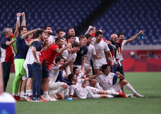8月3日,西班牙球員在獲勝后慶祝合影。新華社記者曹燦攝