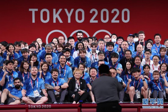 8月4日,東京奧運會舉重項目落幕,場館志愿者們一起合影留念。新華社記者 楊磊 攝