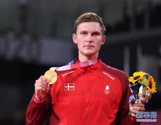 8月2日,丹麥選手安賽龍在東京奧運會羽毛球男子單打項目頒獎儀式上展示金牌。新華社記者 歐東衢 攝