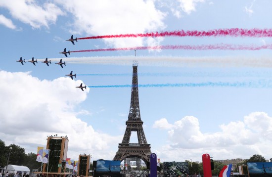 在巴黎現場,“法蘭西巡邏兵”飛行表演隊將天空渲染成了藍白紅三色,F場播放的宣傳片中,埃菲爾鐵塔化身大型“旗桿”,通過電腦特效在塔身上展示了帶有巴黎奧運會會徽的虛擬旗幟。