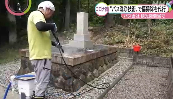 巴士租賃公司工作人員使用高壓水槍對墓碑進行清潔。(NHK電視臺視頻截圖)
