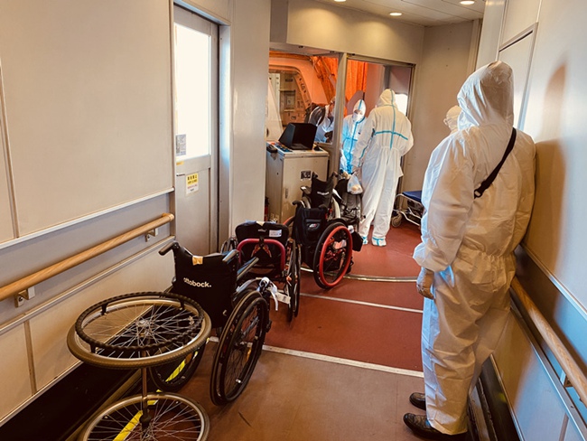 中國國際航空公司日本地區工作人員身穿防護服在廊橋迎接參加2020年東京殘奧會的首批中國體育代表團。(圖片來源:東京成田機場工作人員供圖)