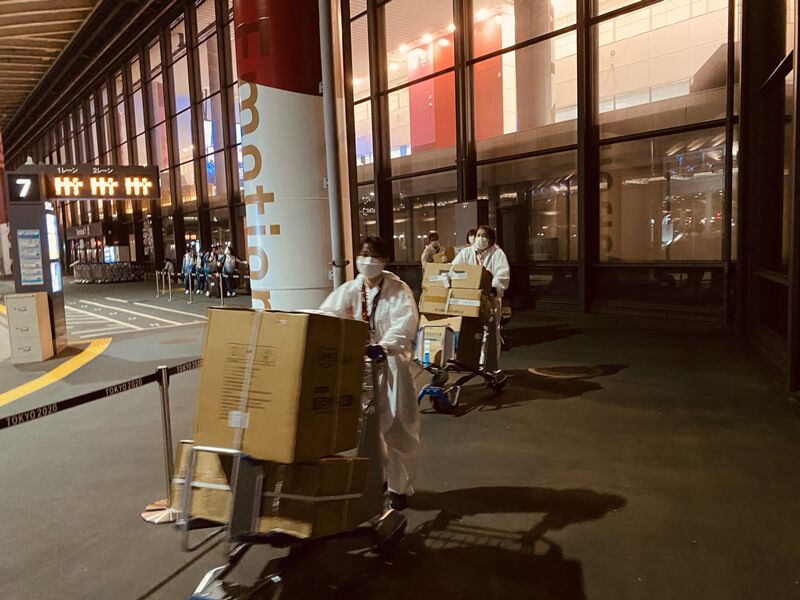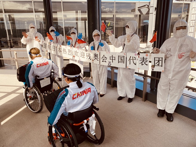 19日,參加2020年東京殘奧會的首批中國體育代表團抵達日本東京成田機場。(圖片來源:東京成田機場工作人員供圖)