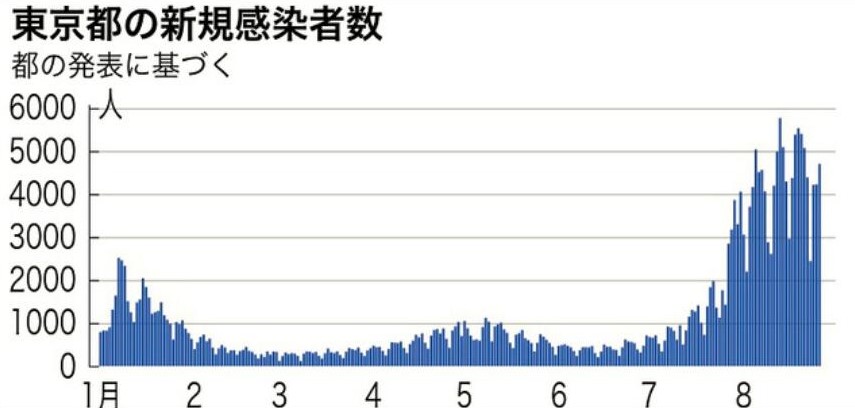 東京都最近半年間的新增確診病例數變化趨勢圖。(圖片來源:《朝日新聞》)