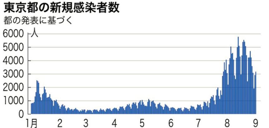 東京都最近半年間的新增確診病例數變化趨勢圖。(圖片來源:《朝日新聞》)