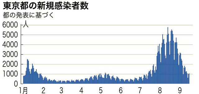 東京都最近半年間的新增確診病例數變化趨勢圖。(圖片來源:《朝日新聞》)