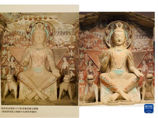 這張拼版照片顯示的是,左:敦煌研究院文物數字化研究所提供的敦煌莫高窟第275窟交腳彌勒菩薩照片;右:9月13日在日本東京藝術大學美術館拍攝的用“文化遺產克隆技術”做出的、敦煌莫高窟第275窟交腳彌勒菩薩70%比例大小的佛像(新華社記者 郭丹 攝)。