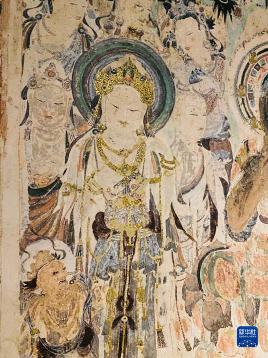這是9月13日在日本東京藝術大學美術館拍攝的用“文化遺產克隆技術”做出的敦煌莫高窟第57窟壁畫《彌勒說法圖》局部。新華社記者 郭丹 攝