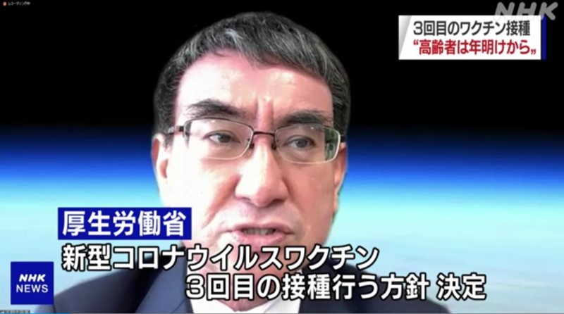 日本行政改革擔當大臣兼疫苗接種負責人河野太郎表示,日本政府決定實施第三劑新冠疫苗的接種工作。(NHK電視臺視頻截圖)