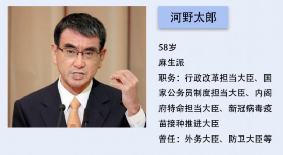 河野太郎出身政治世家,祖父河野一郎曾擔任日本副總理、1964年東京奧運擔當大臣、建設大臣等,叔祖父河野謙三曾任參議院議長。父親河野洋平曾擔任日本自民黨總裁、外務大臣等,在內閣官房長官任內發表了著名的“河野談話”,承認日本政府曾參與強制征用慰安婦的問題。