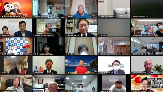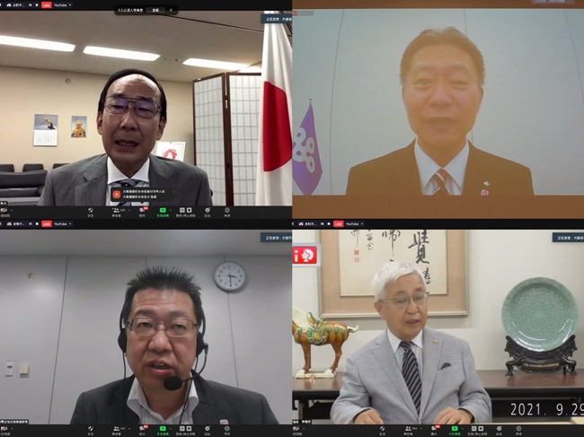9月29日,日本外務省關西擔當大使山本條太、大阪府知事吉村洋文、大阪市長松井一郎及大阪府日中友協會長梶本德彥在線致辭。(圖片由中國駐大阪總領館提供)