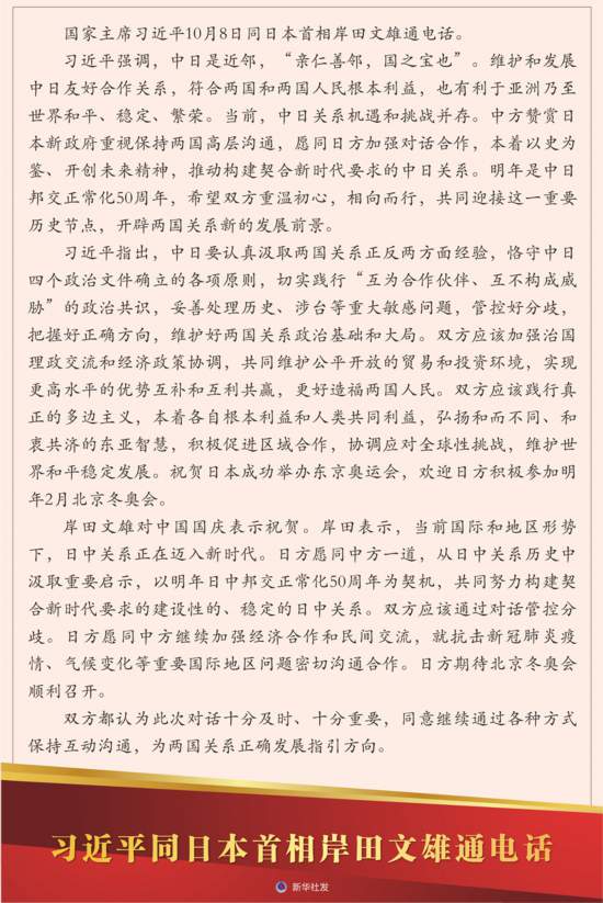 新華社北京10月8日電 國家主席習近平10月8日同日本首相岸田文雄通電話。