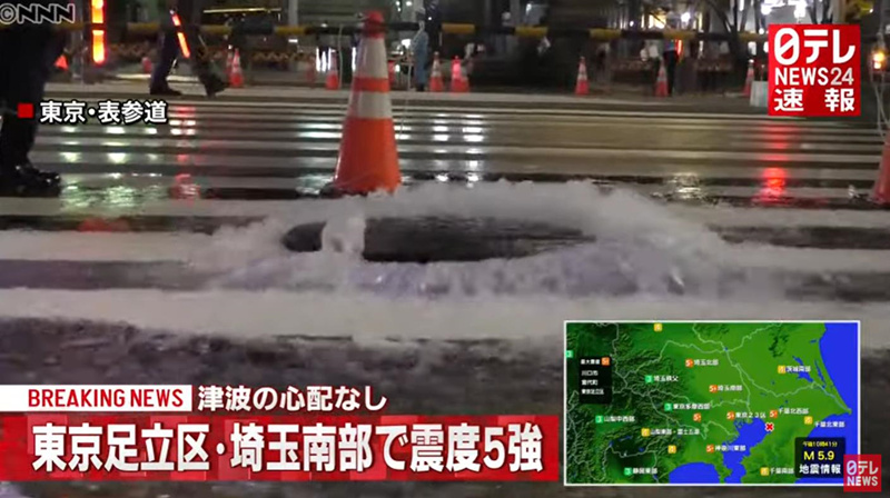 7日晚發生的地震導致東京都23區有30個地點發生漏水事故。(圖片來源:日本電視臺視頻截圖)