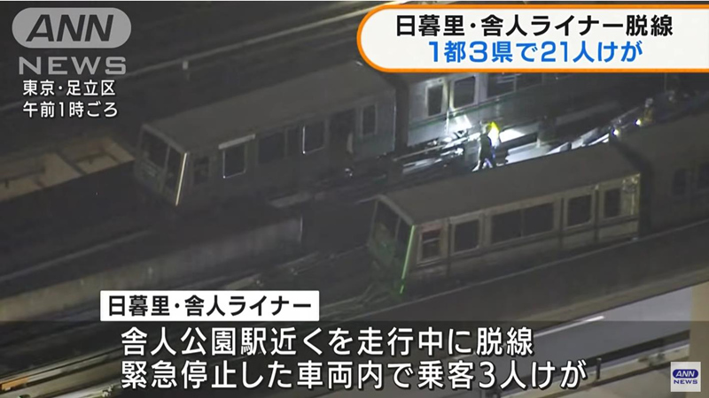 8日,日暮里舍人線電車因地震導致出軌,車內3名乘客受傷。(圖片來源:全日本新聞網視頻截圖)