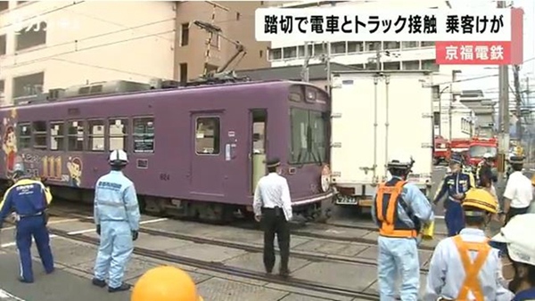 人民網東京10月13日電(李沐航)據關西電視臺報道,13日早晨8點半左右,在日本京都市中京區的京福電鐵西院車站附近一處道口,一輛正常向四條大宮方向行駛的電車與一輛卡車相撞,事故造成一名男性乘客受傷。