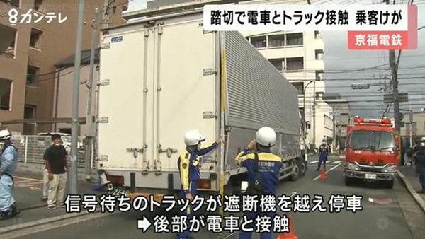 日本京都市中京區一處道口發生電車與卡車相撞事故。(圖片來源:關系電視臺視頻截圖)