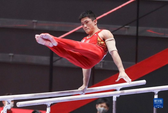 10月24日,侍聰在雙杠決賽中。當日,2021年世界體操錦標賽男子雙杠決賽在日本北九州市舉行,中國選手侍聰以15.066的成績獲得季軍。新華社記者 杜瀟逸 攝