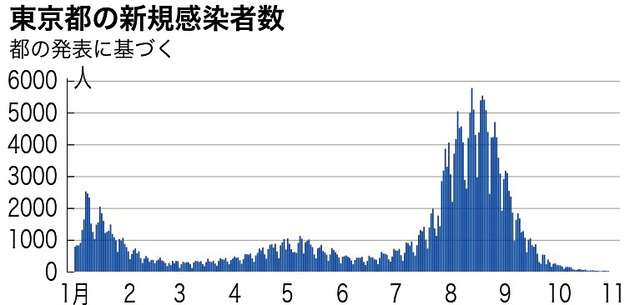 東京都最近半年間的新增確診病例數變化趨勢圖。(圖片來源:《朝日新聞》)