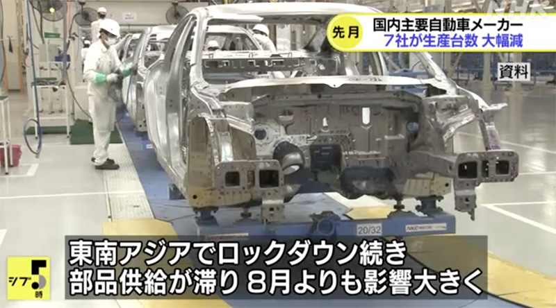 因東南亞地區的新冠疫情持續擴散,導致當地工廠的汽車零部件生產和供應受阻。(NHK電視臺視頻截圖)