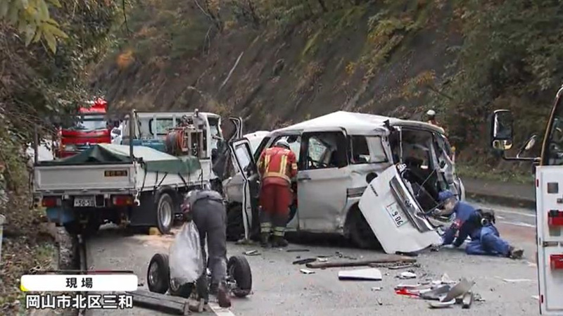 11月4日早晨8點15分左右,在岡山縣岡山市北區,一名82歲女性駕車先后與6車相撞后死亡。(岡山電視臺視頻截圖)
