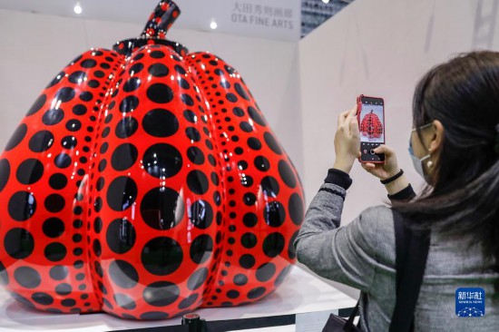 當日,日本藝術家草間彌生2019年創作的作品《南瓜》亮相第四屆中國國際進口博覽會服務貿易展區。
