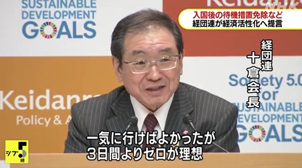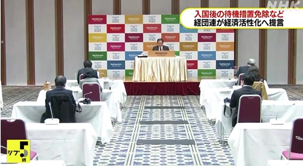 日本經濟團體聯合會在8日舉行的會議上向日本政府建議免除已完成疫苗接種入境外國人的隔離措施。(NHK電視臺視頻截圖)