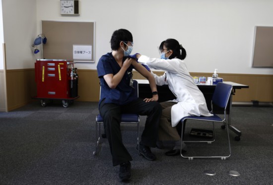 2月17日,醫護人員在日本東京接種疫苗。新華社發(貝赫魯茲·邁赫里攝)