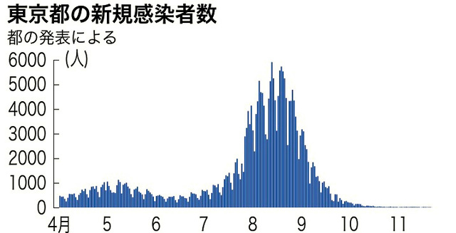 東京都最近半年間的新增確診病例數變化趨勢圖。(圖片來源:《朝日新聞》)