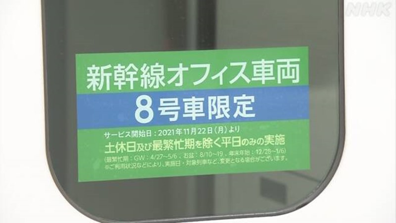 新冠疫情期間,“遠程辦公”模式在日本逐漸普及。JR旗下的各鐵路公司陸續引入了“遠程辦公專用車廂”服務。其中,北陸新干線的“光輝號”和“白鷹號”將8號車廂改為“遠程辦公專用車廂”,車廂入口處貼有“新干線辦公車廂”的標識。在該車廂內,乘客可進行線上會議,也能夠使用手機通話。